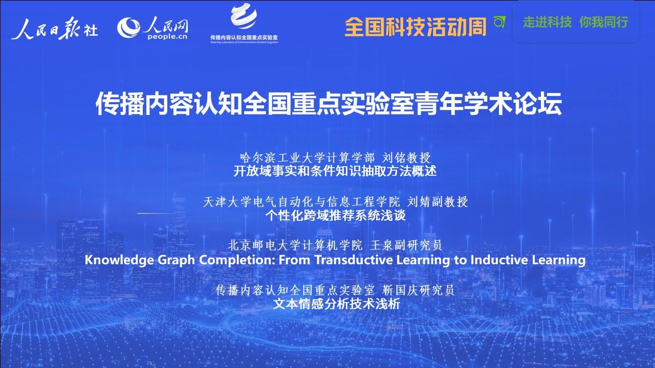 本次論壇由實(shí)驗(yàn)室首席科學(xué)家張勇東教授主持,邀請(qǐng)了哈爾濱工業(yè)大學(xué)計(jì)算學(xué)部劉銘教授、天津大學(xué)電氣自動(dòng)化與信息工程學(xué)院劉婧副教授、北京郵電大學(xué)計(jì)算機(jī)學(xué)院王泉副研究員、傳播內(nèi)容認(rèn)知全國(guó)重點(diǎn)實(shí)驗(yàn)室靳國(guó)慶研究員這四位青年研究學(xué)者分別圍繞知識(shí)圖譜技術(shù)、個(gè)性化推薦技術(shù)、文本情感分析技術(shù)等內(nèi)容,做了《開放域事實(shí)和條件知識(shí)抽取方法概述》《個(gè)性化跨域推薦系統(tǒng)淺談》《Knowledge Graph Completion: From Transductive Learning to Inductive Learning》《文本情感分析技術(shù)淺析》這四個(gè)專題報(bào)告,展現(xiàn)了知識(shí)圖譜、個(gè)性化推薦、情感分析等這些關(guān)鍵核心技術(shù)在相關(guān)領(lǐng)域的最新進(jìn)展和研究成果,并對(duì)未來發(fā)展趨勢(shì)做出深刻思考。
